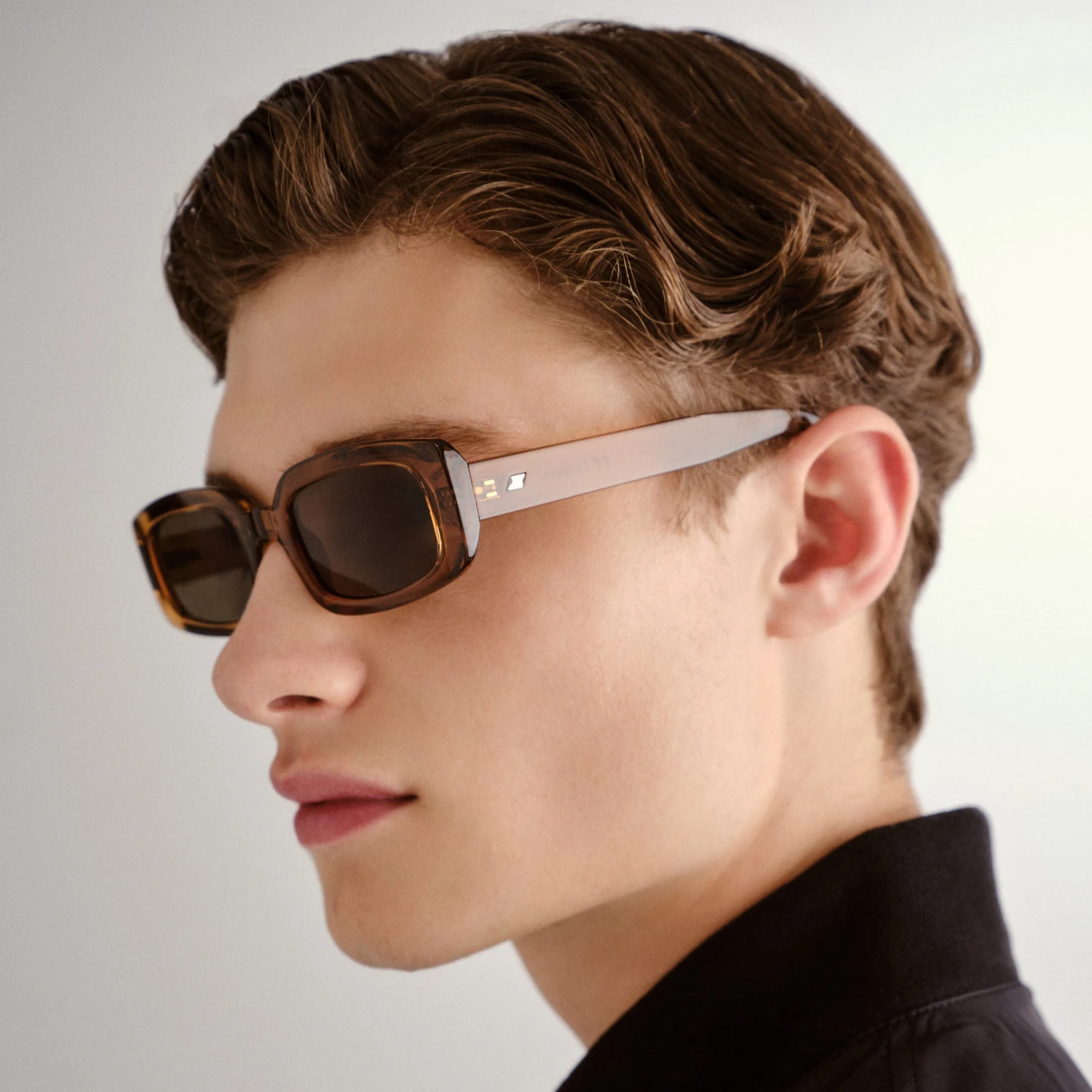 Designed with narrow proportions and wide fit for all face sizes, our DYNAMITE rectangular frame sunglasses are a wardrobe staple for both guys and girls. Featuring a classic noughties-inspired look, this unisex sunglass features discreet Le Specs metal stud detailing on both temples.