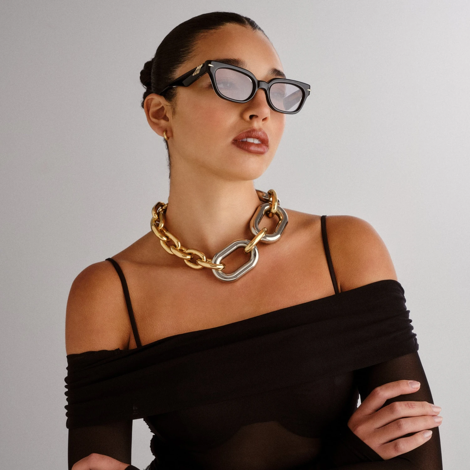With striking lines and prominent proportions, our NUMERO TRES modern rectangle sunglasses offer a petite 90s inspired look. Made from bespoke custom 8mm & 6mm acetates, this frame highlights delicate chamfering detail meticulously added to every aspect of the frame, providing a soft and rounded luxurious, hand polished look and feel. Each pair is finished with Le Specs signature three dimensionally crafted Infinity flagstripe metal decal and iconic single flagstripe inspired rounded rivet offering an unparallel level of sophistication.